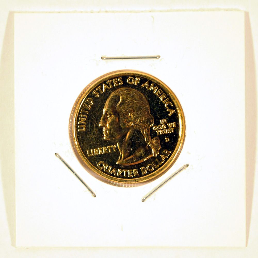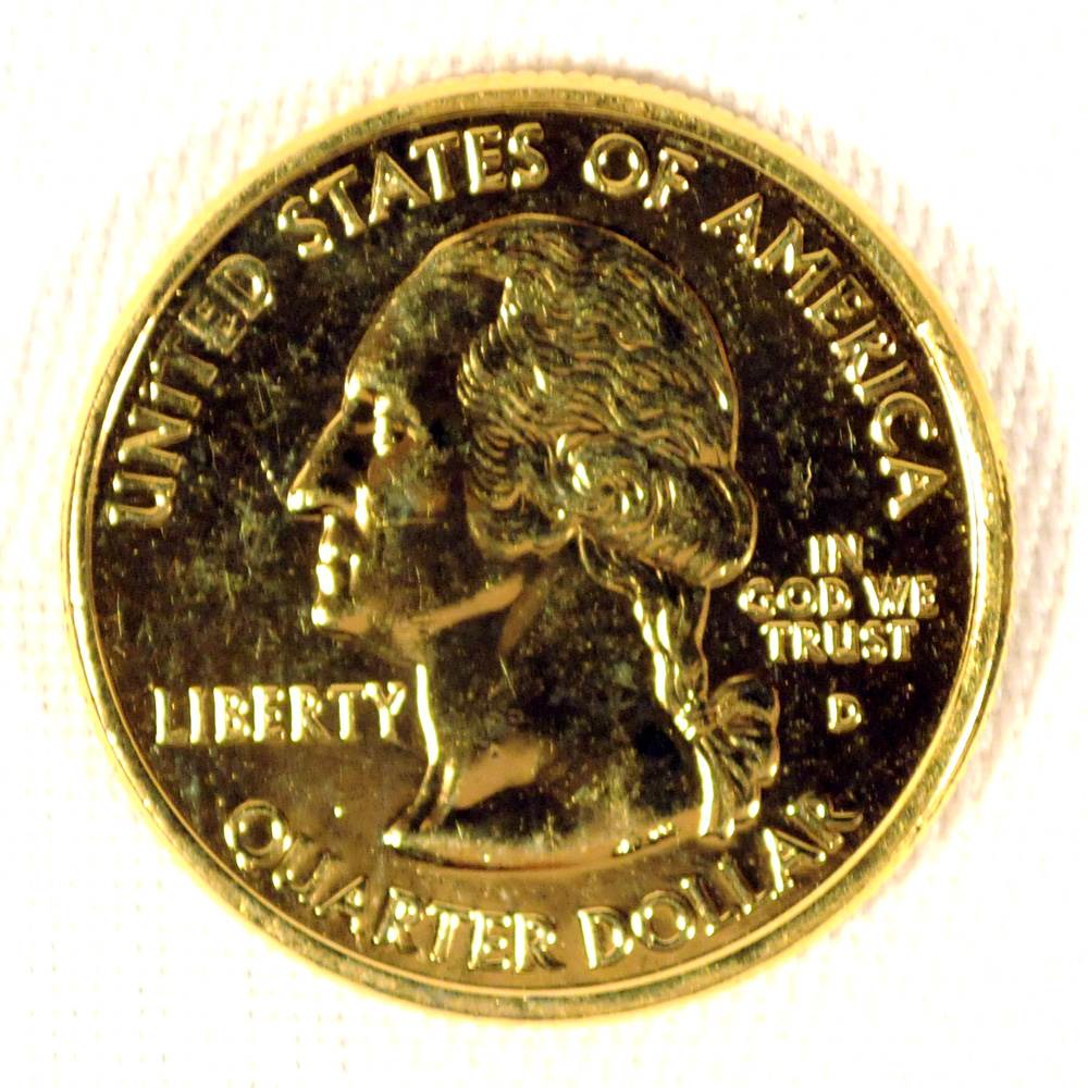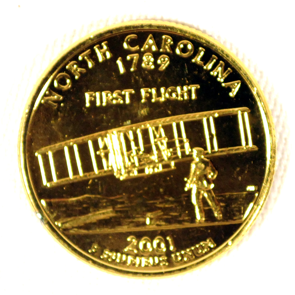A 2001 D gold plated North Carolina State Quarter. Uncirculated condition. Will ship in cardboard folder. Exact item is pictured.